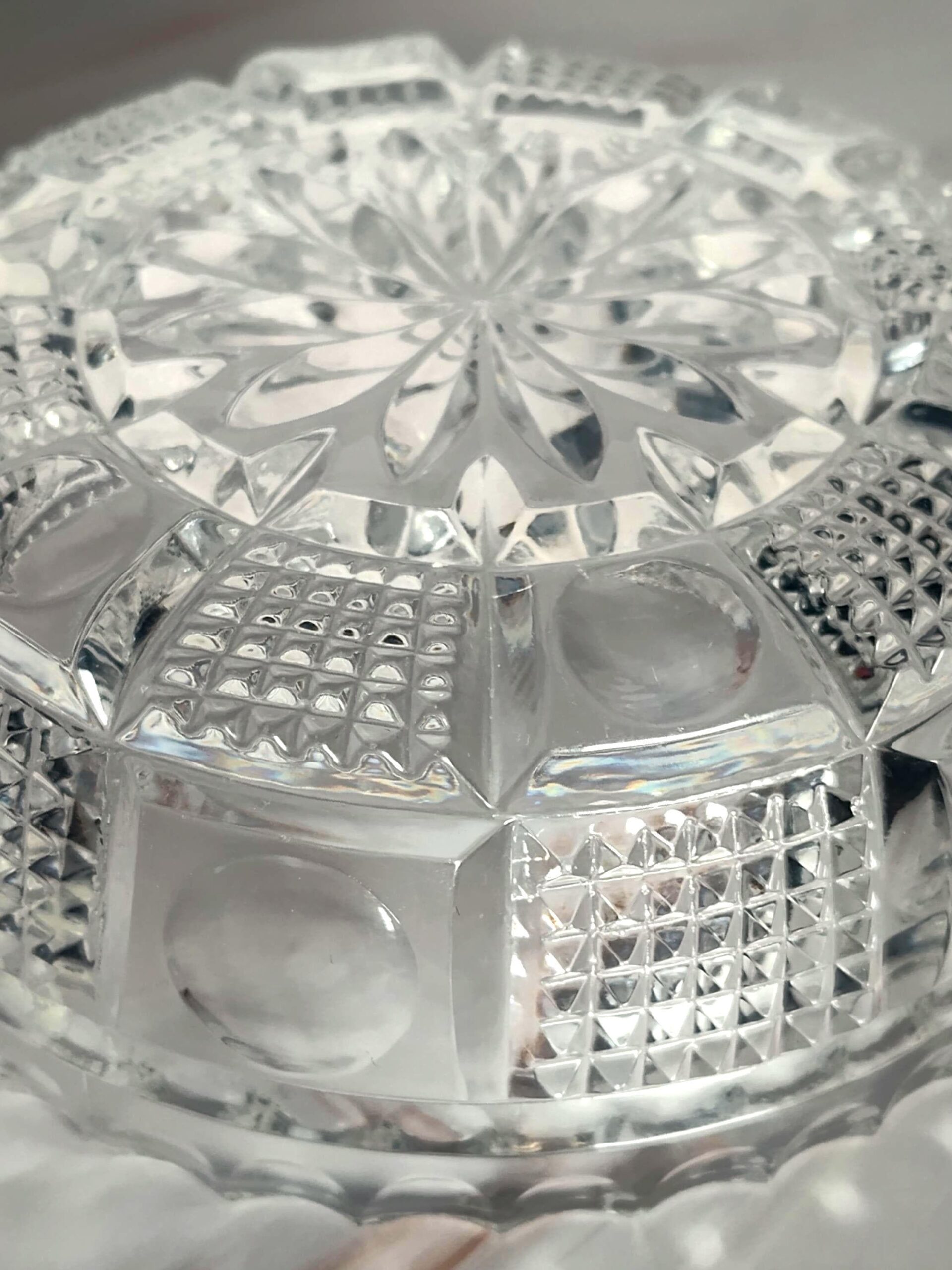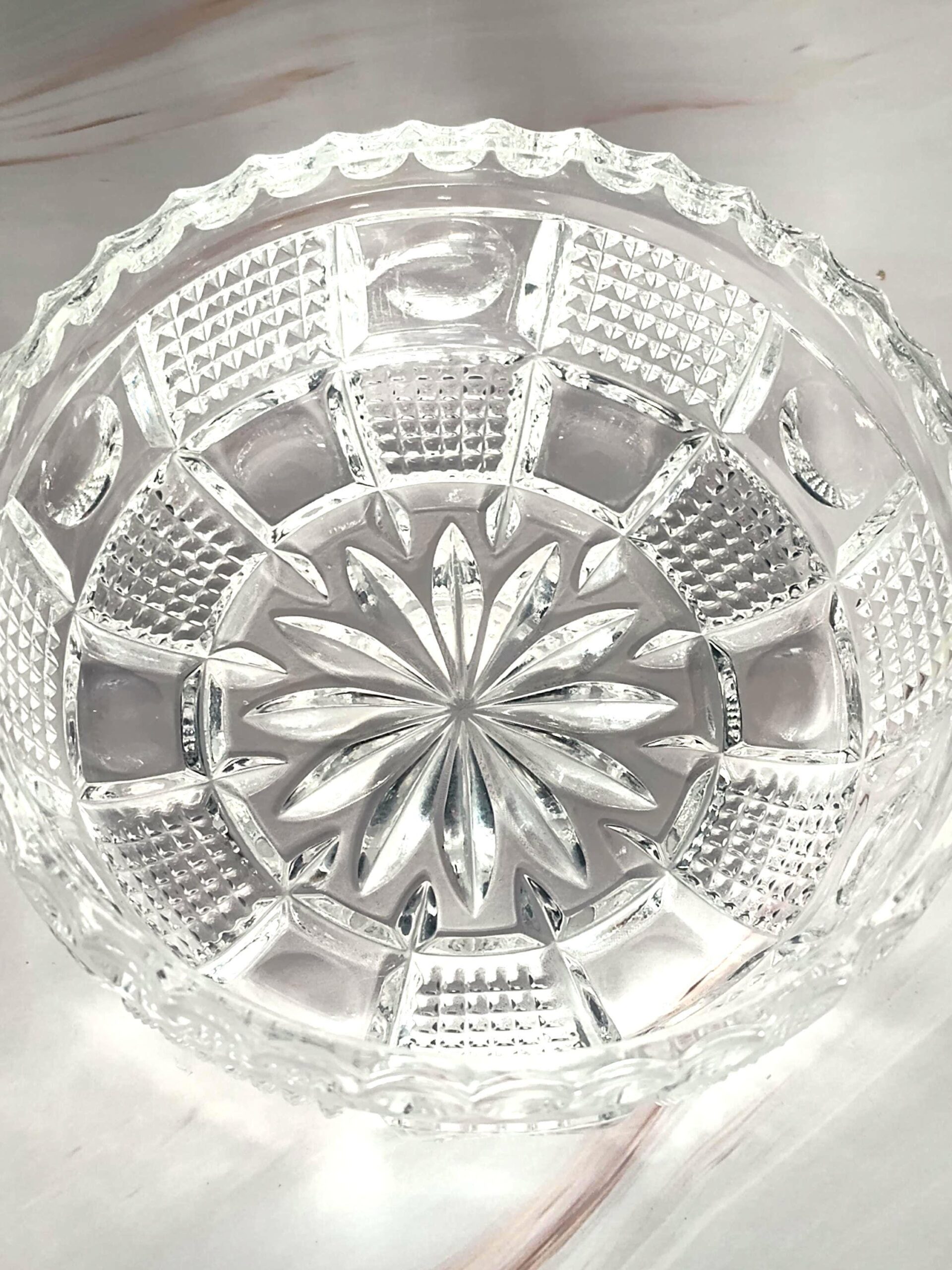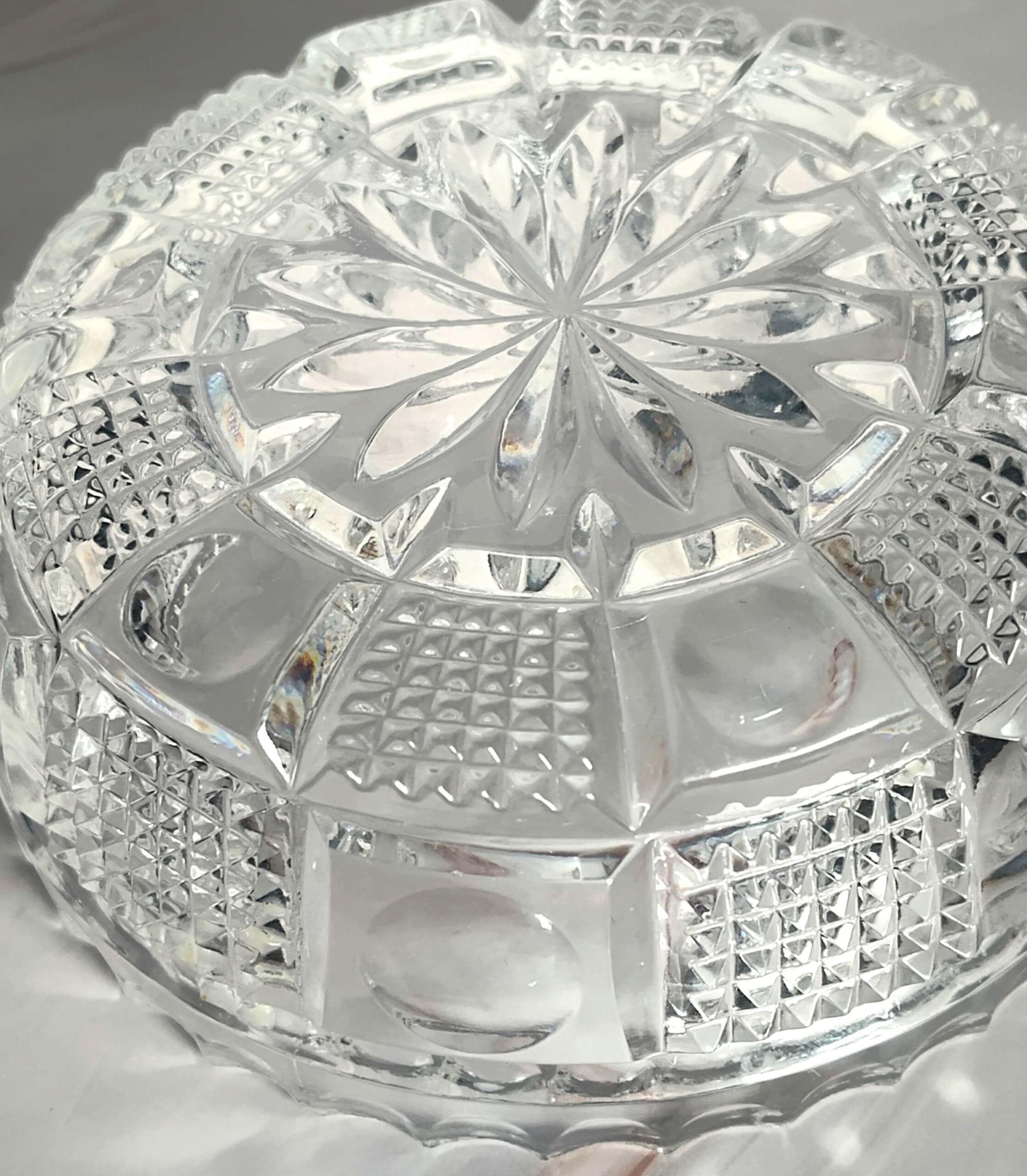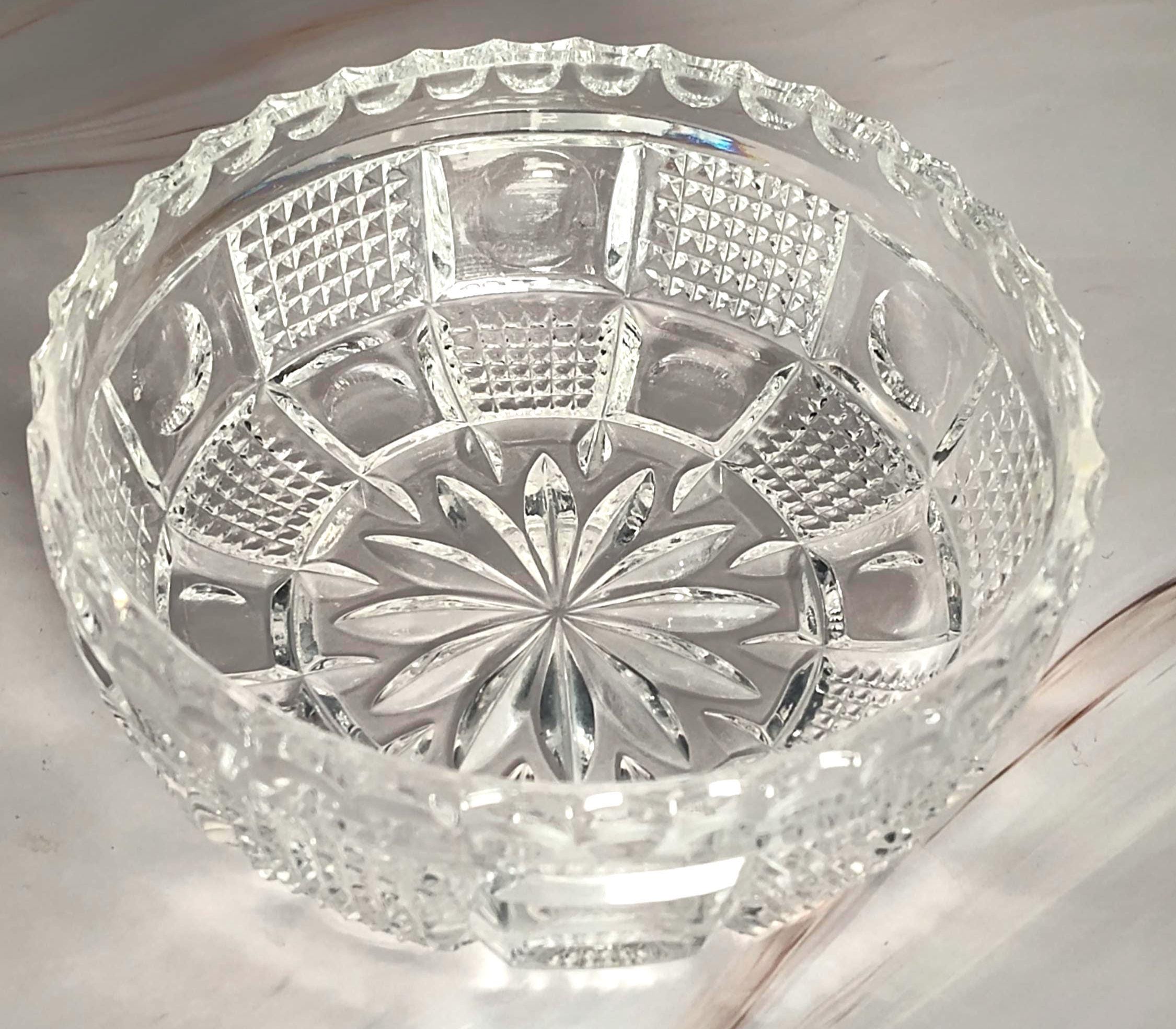 This antique American Brilliant Period hand-cut glass nappy bowl showcases the extraordinary craftsmanship that defined the golden age of American glass cutting from the 1870s through the early 1900s. The 4 5/8" diameter bowl stands 1 3/4" tall and features an intricate hobstar starburst pattern on the base surrounded by alternating panels of fine crosshatch diamond point cutting and smooth thumbprint ovals. The distinctive sawtooth scalloped rim adds the finishing touch that collectors associate with the finest ABP pieces. The deep precise cuts catch and refract light brilliantly, demonstrating the skilled hand cutting that made American glass the envy of the world during this period. This versatile small bowl works beautifully as a candy dish, nut bowl, jewelry holder, trinket dish, or vanity accessory. The intricate cutting creates dazzling light play that makes this piece equally at home on a dining table, dressing table, or displayed in a curio cabinet. The compact size makes it perfect for small spaces while still delivering the visual impact of a much larger piece. A wonderful accent for Victorian, Edwardian, or traditional decor styles. This antique ABP cut glass nappy bowl is in excellent condition with no chips or cracks and the hand-cut pattern remaining crisp and sharp throughout. This piece appeals to collectors of American Brilliant Period glass, antique cut glass enthusiasts, and anyone who appreciates the artistry of hand-cut crystal from over a century ago. The combination of intricate hobstar and diamond cutting, authentic ABP craftsmanship, excellent condition, and timeless elegance makes this a worthy addition to any collection of fine antique glassware.