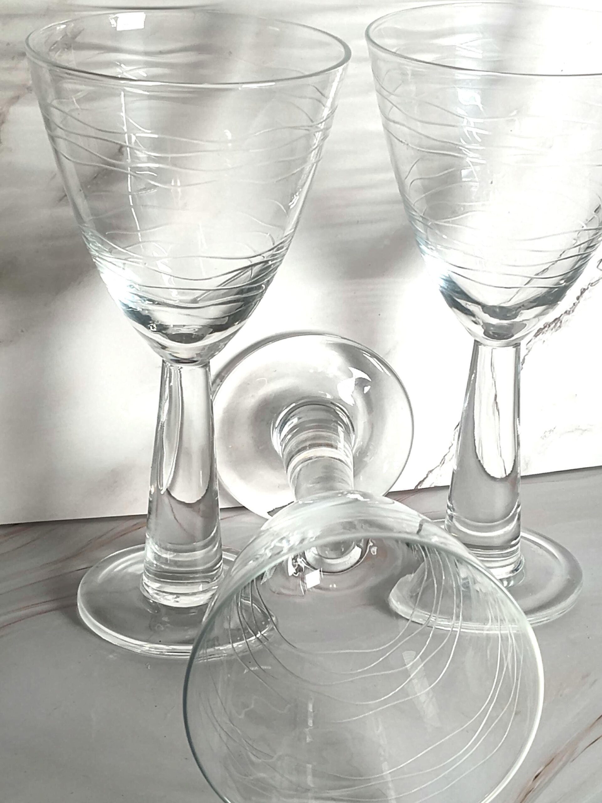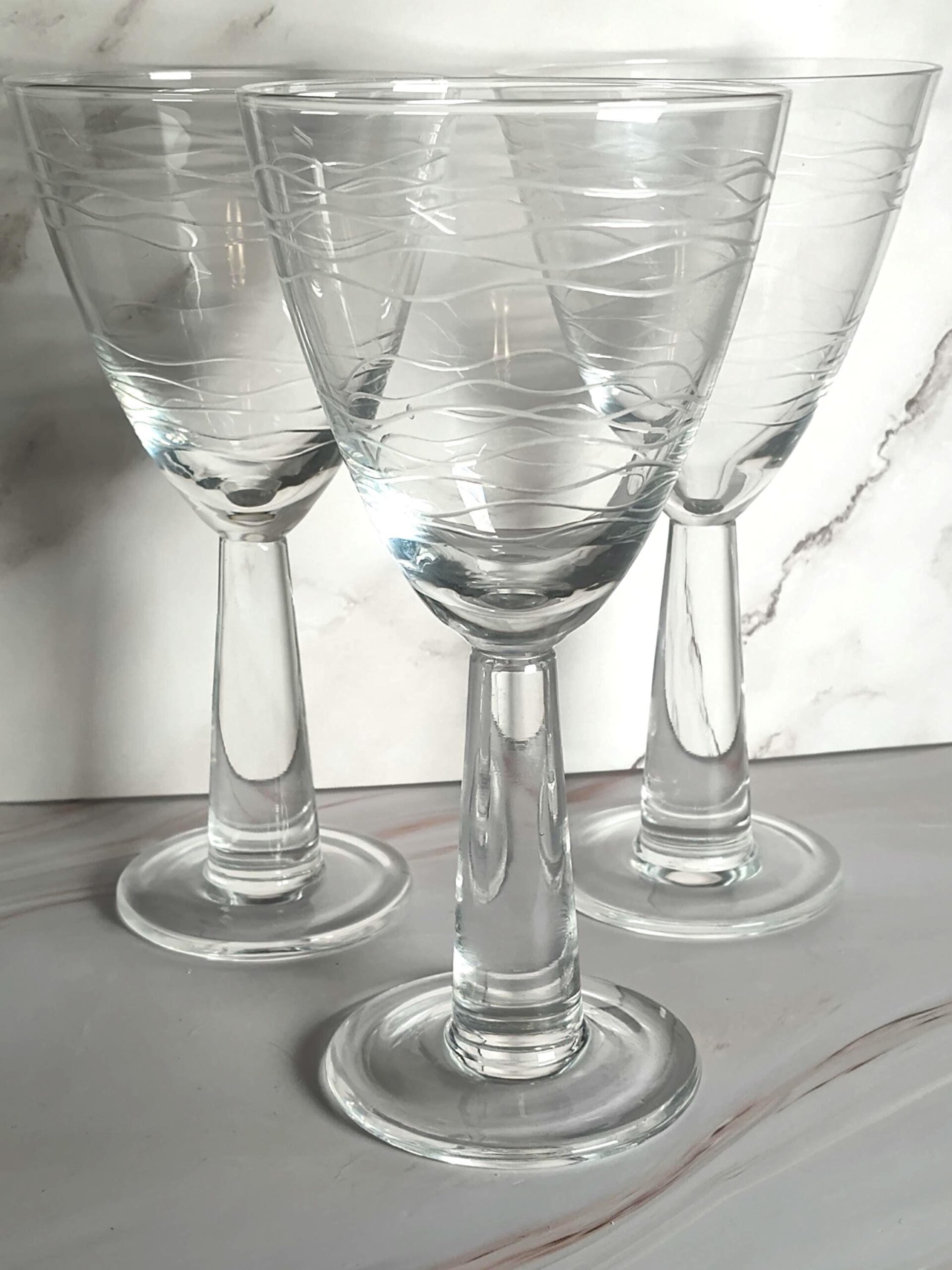Block Crystal Ocean Wine Glasses Set of 3 Etched Wave Pattern Clear Stemware Discontinued