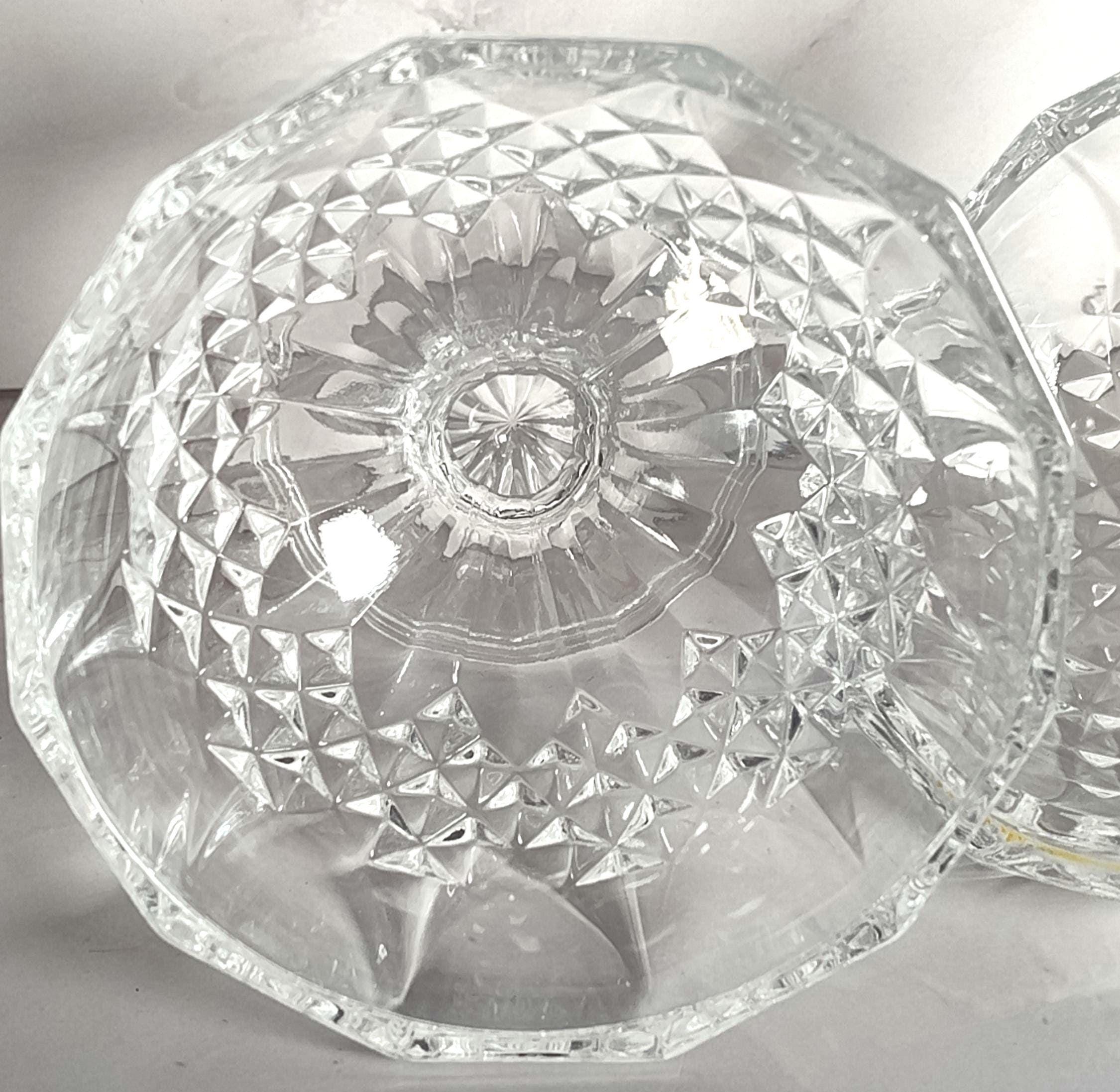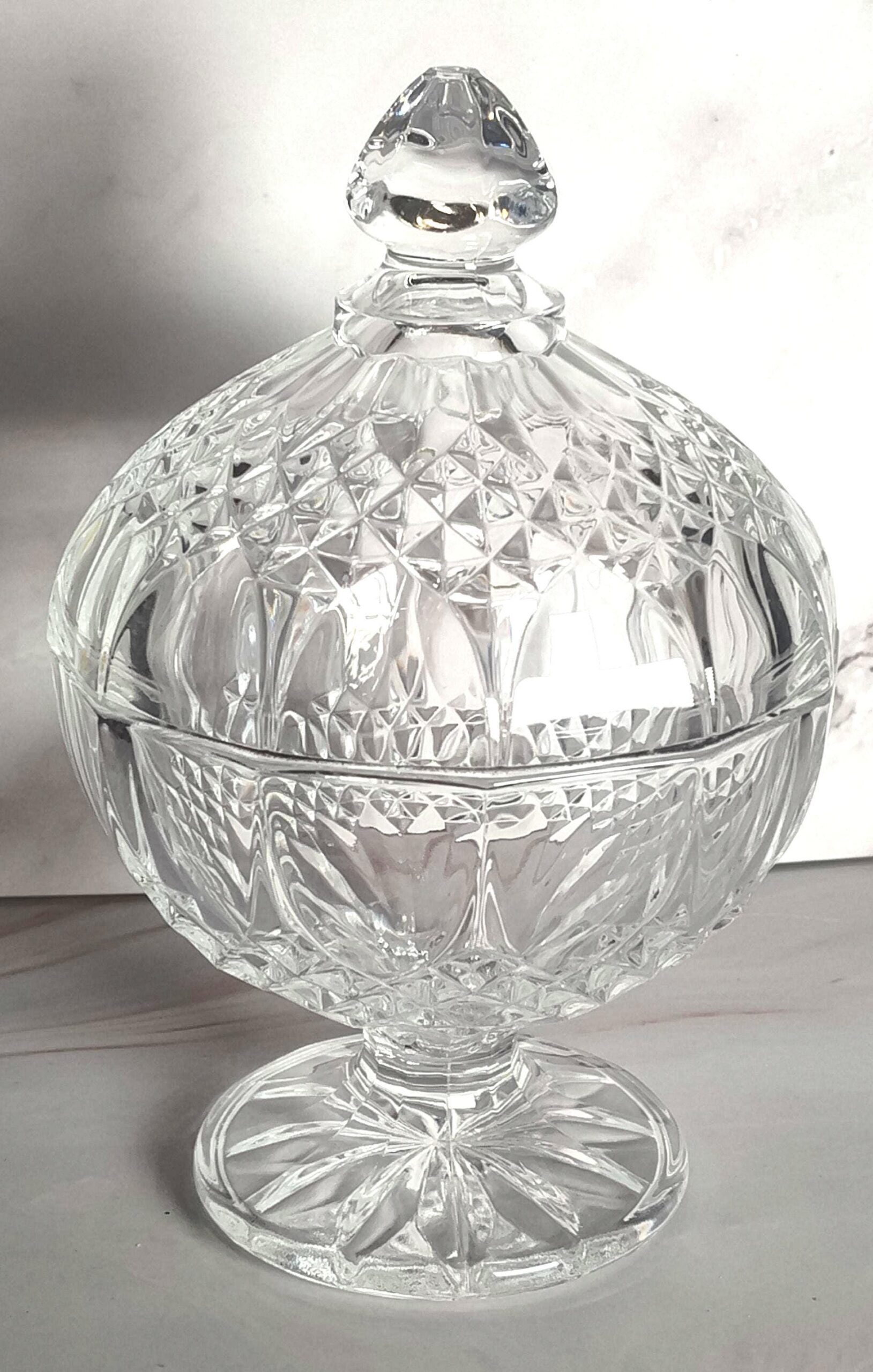 This elegant Cristal d'Arques Longchamp crystal covered candy dish features the iconic diamond crosshatch and fan starburst pattern that has made this French crystal line a collector favorite. The footed bowl with a domed lid and faceted finial creates a beautiful globe-like silhouette that sparkles from every angle. The star-cut base and detailed cutting throughout showcase the quality craftsmanship that Cristal d'Arques is known for. The dish stands 6 1/2" tall with the lid on and measures 4 1/8" in diameter. It is in excellent condition with no chips, cracks, or cloudiness. The crystal is clear and bright, and the cut patterns are crisp and well defined. The lid fits snugly and the finial provides a comfortable grip. This piece has serious weight and sparkle. Perfect for candy, mints, nuts, jewelry, potpourri, or as a standalone decorative accent on a dresser, vanity, or coffee table. The Longchamp pattern is discontinued and remains one of the most popular and recognizable French crystal designs ever produced. Makes a wonderful gift for any crystal collector. Thanks for stopping by and feel free to reach out with any questions!Additional information
