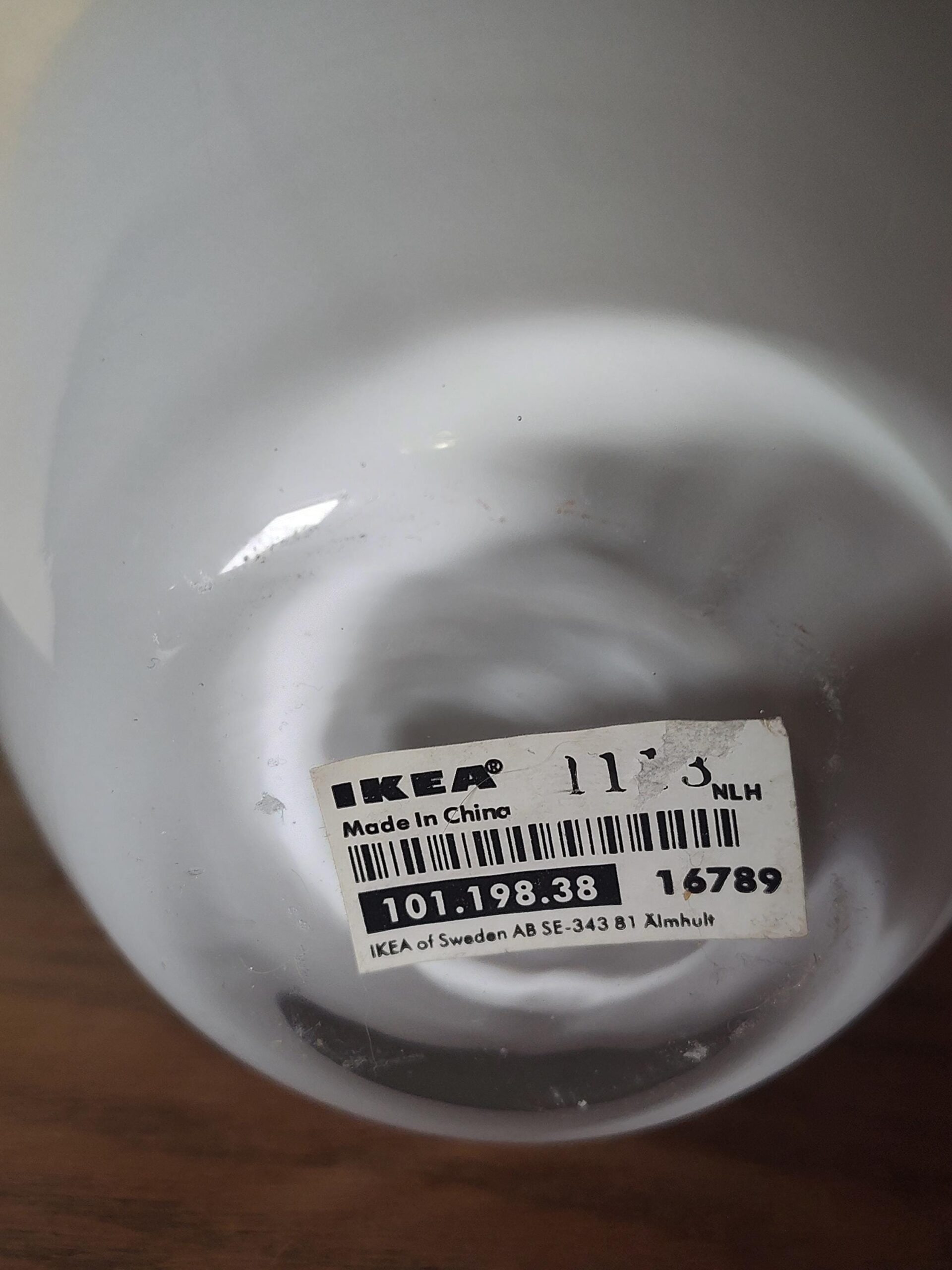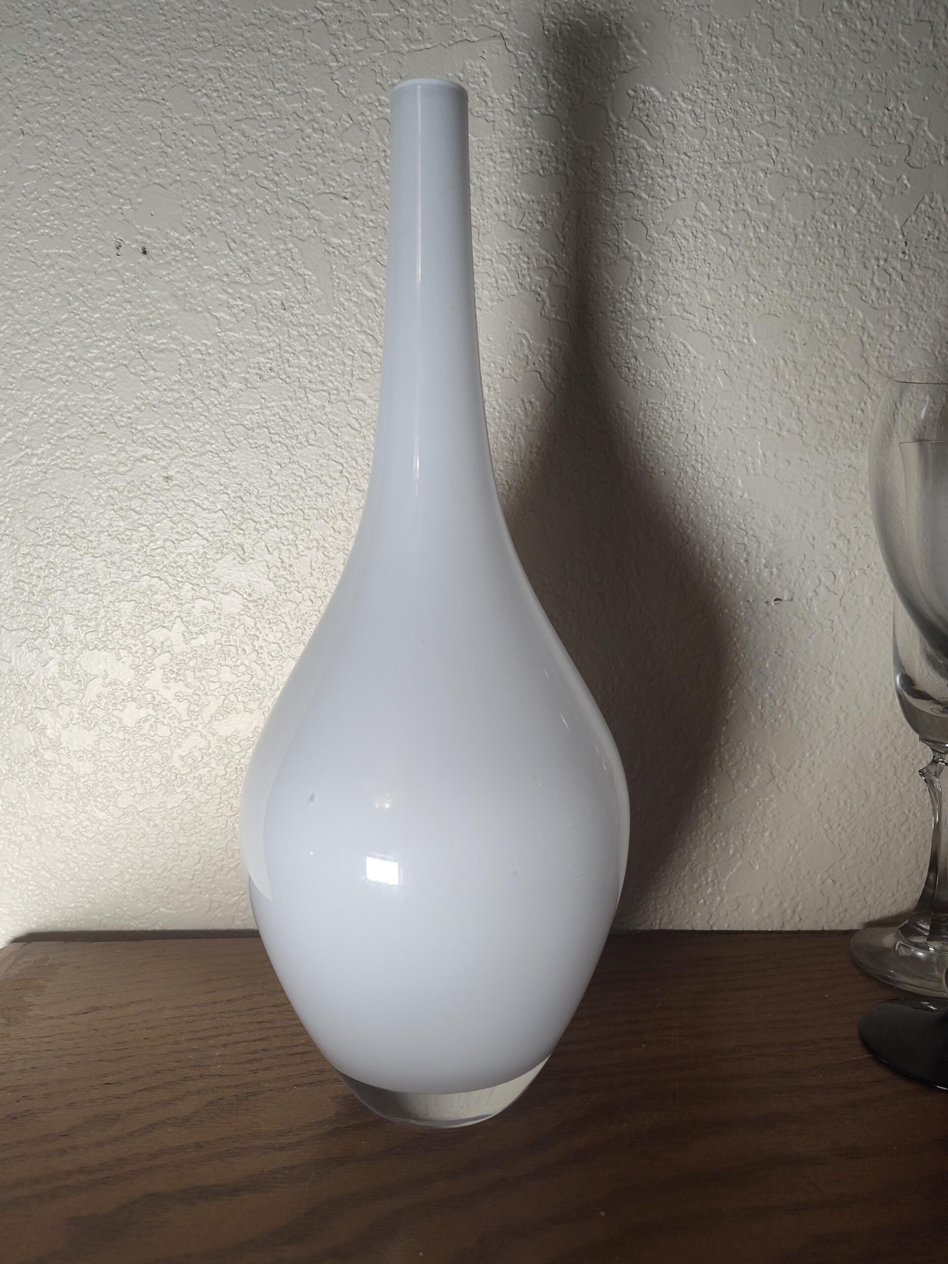 Sleek IKEA Salong white cased glass vase in excellent condition. This discontinued design features a smooth teardrop/gourd shaped body with a long tapered neck, finished in glossy white opaline glass over a clear glass base. The minimalist Scandinavian silhouette makes a striking statement piece on any shelf, mantel, or table. This vase stands 12 1/2 inches tall and measures approximately 4 1/2 inches at the widest point. The narrow neck opening is perfect for a single stem or small dried arrangement. The clear glass bottom adds a subtle design detail. Still has the original IKEA label. Free of chips, cracks, or scratches. A beautiful accent piece for modern, minimalist, or Scandinavian inspired decor. This model has been discontinued by IKEA and is no longer available in stores.Additional information
