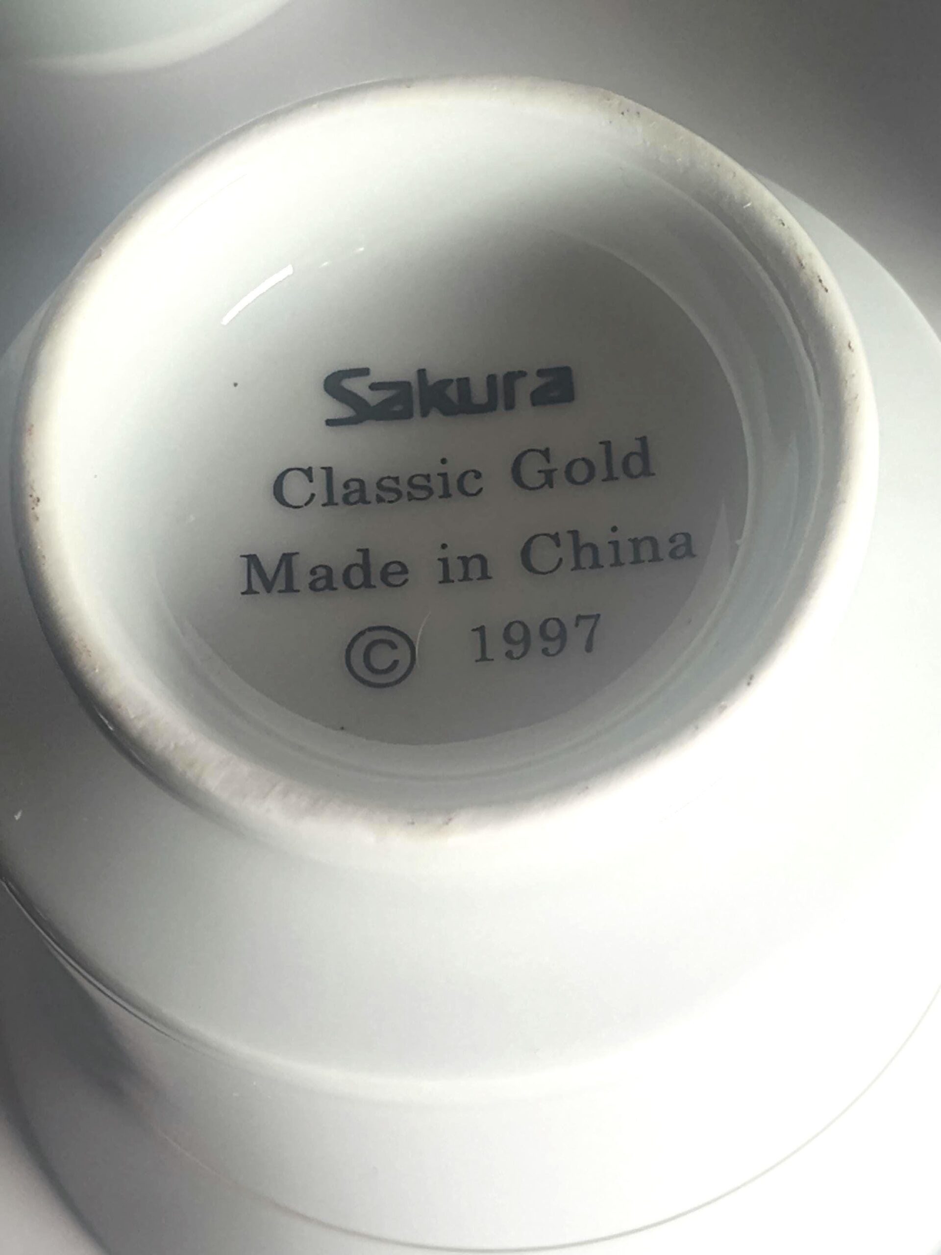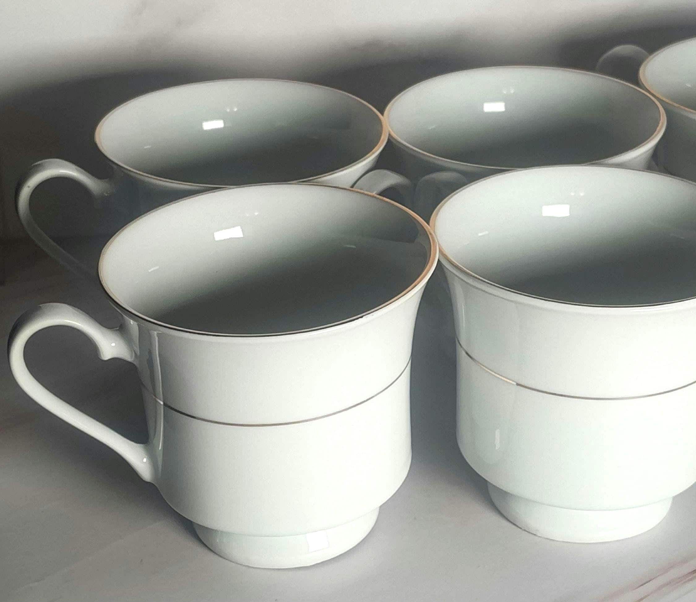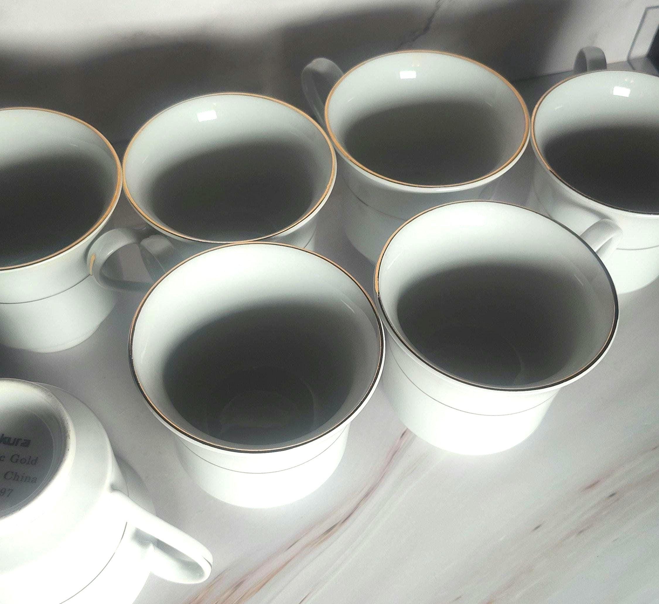 This is a beautiful set of 7 vintage Sakura Classic Gold teacups from 1997. These elegant white cups feature delicate gold trim along the rim and a thin gold pinstripe band around the body. The Classic Gold pattern has been discontinued, making these a great find for collectors or anyone looking to complete their set. Each cup stands 3" tall with a 3 1/8" mouth opening. The gold edging is in great condition with no visible wear, and there are no chips or cracks. These are well-made cups with a classic, timeless look that works just as well for everyday use as it does for more formal settings. All 7 cups are marked "Sakura, Classic Gold, Made in China, © 1997" on the base. Saucers are not included. Please note that gold trim means these cups are not microwave safe. Thanks for stopping by — feel free to reach out with any questions!