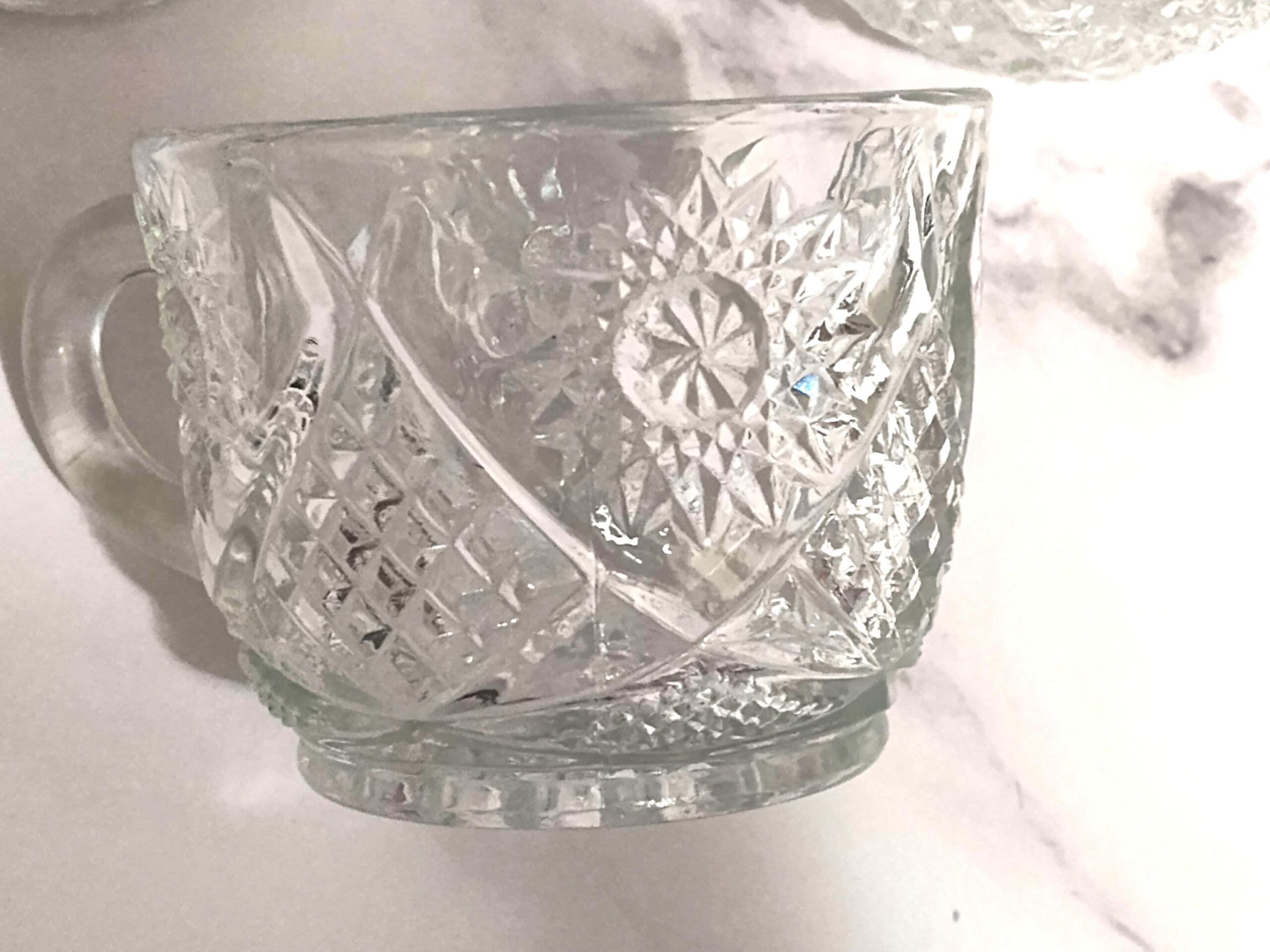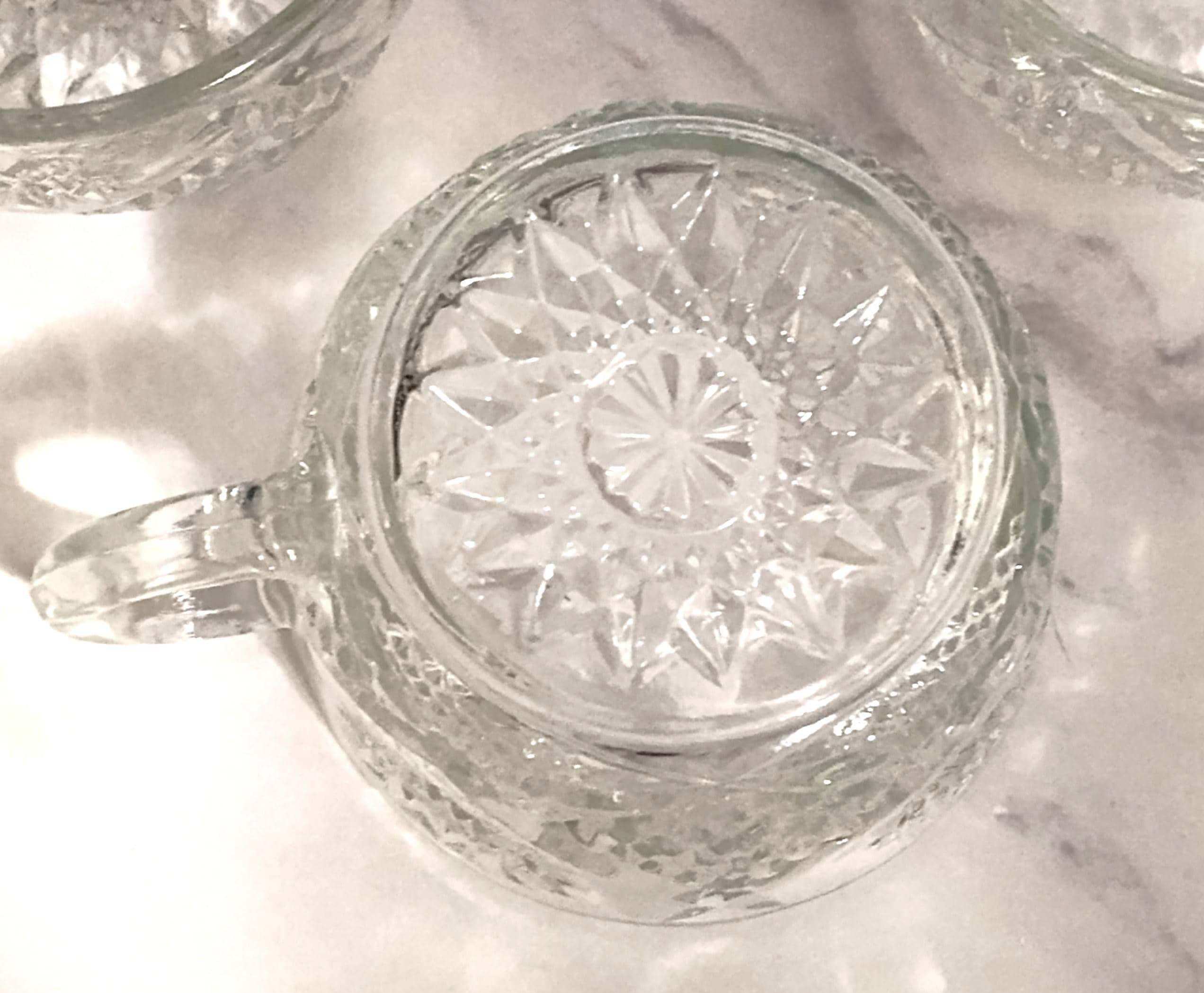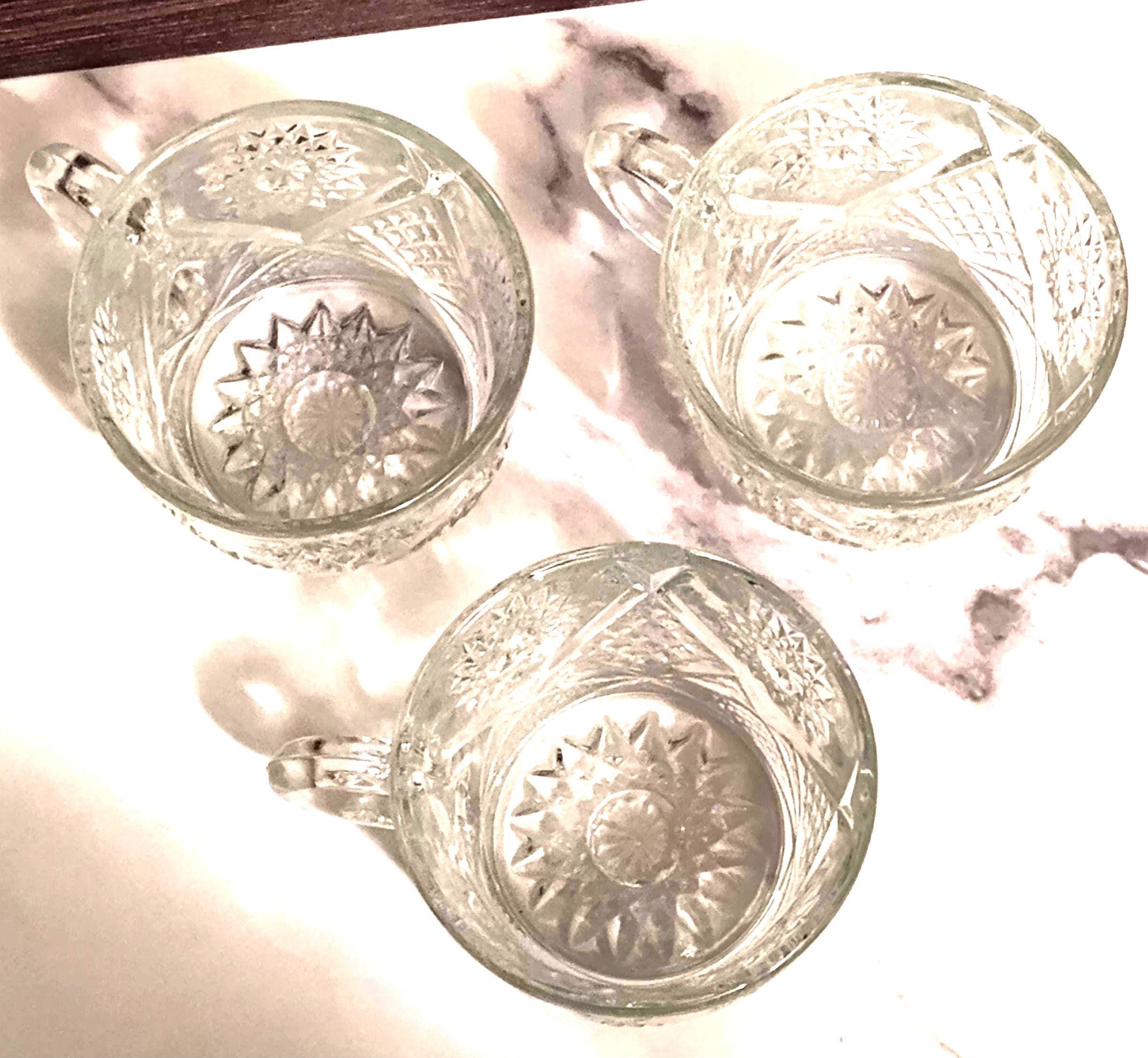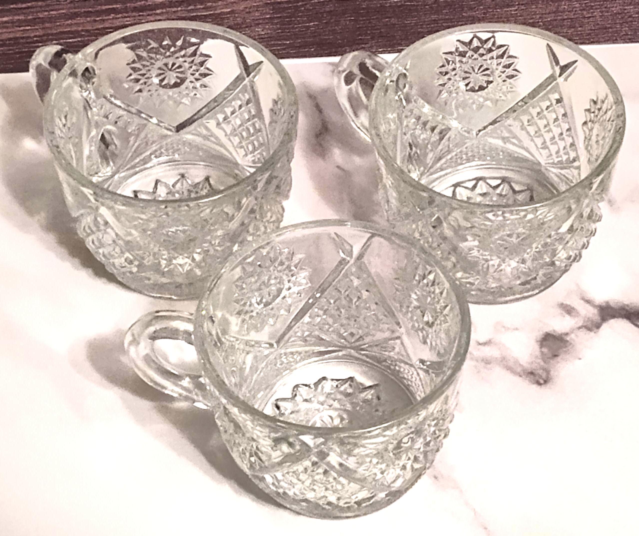 Indiana Glass Company created the Saratoga pattern featuring elegant pressed glass designs that showcase their expertise in pattern work. The distinctive design elements make Saratoga easily recognizable among Indiana Glass collectors. These punch cups represent the matching stemware components of complete punch bowl sets that were essential for entertaining during the 1970s. Clear pressed glass like this was valued for its versatility in working with any table setting or color scheme while the detailed pattern added decorative interest. Indiana Glass pieces were affordable quality that allowed families to entertain with style without extravagance. The set of 3 provides starter service for small gatherings or the foundation for building a complete Saratoga collection. Each punch cup in the Saratoga pattern provides the standard size proportions designed for serving punch, though these versatile cups work for many beverage and serving purposes. This set of 3 offers matching service for small gatherings or makes an excellent beginning to a larger Saratoga pattern collection. These multi-purpose cups work beautifully for serving punch at parties, hot beverages like coffee and tea, cold drinks and juice, individual dessert portions, snacks and candies, or displayed on open shelving to showcase the detailed pressed glass pattern. The clear glass construction ensures these cups work with any entertaining theme or color scheme year-round. This set of 3 Indiana Glass Saratoga pattern punch cups from the 1970s is in excellent vintage condition with the pressed pattern remaining crisp and clear throughout all pieces. These cups appeal to Indiana Glass collectors, Saratoga pattern enthusiasts, and anyone who appreciates quality vintage pressed glass. The combination of distinctive Saratoga pattern, practical multi-use cup design, complete set of three matching pieces, 1970s vintage, and excellent condition makes this a valuable find. Perfect for vintage entertaining with retro charm or as a thoughtful starter set for someone beginning their Indiana Glass collection.